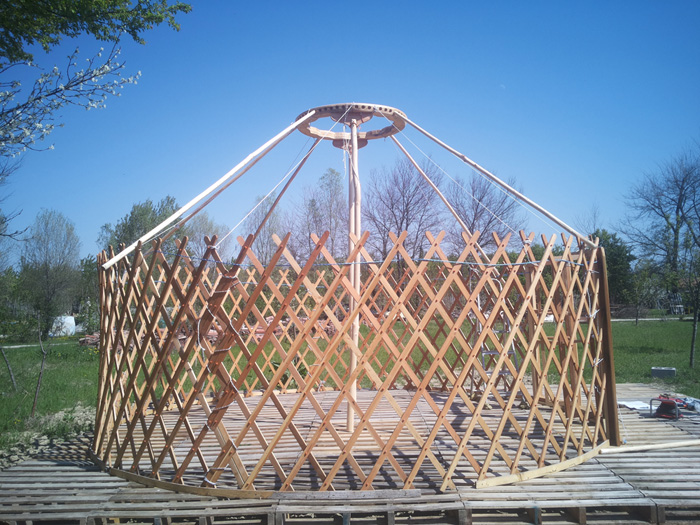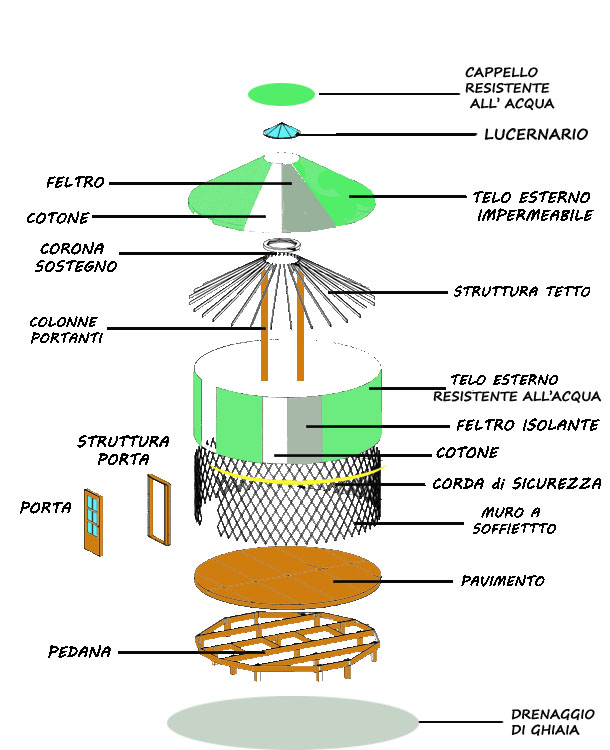 per tenere il calore d' inverno e proteggere dal caldo in estate utilizziamo un feltro di canapa spessore 3 cm. Per le Yurte che vengono smontate di frequente, consigliamo un feltro misto poliestere e fibre più pratico e resistente per essere maneggiato; se la yurta invece rimane fissa e si ha bisogno