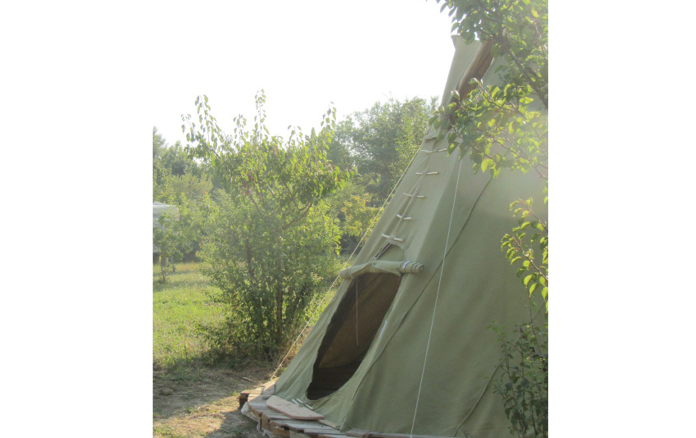 Viene realizzata secondo i disegni e le immagini delle tende dei nativi utilizzando tessuti naturali di cotone oppure piu' resistenti come il policotone o nei casi di maggior umidità e precipitazioni con tessuti sintetici Acrilici