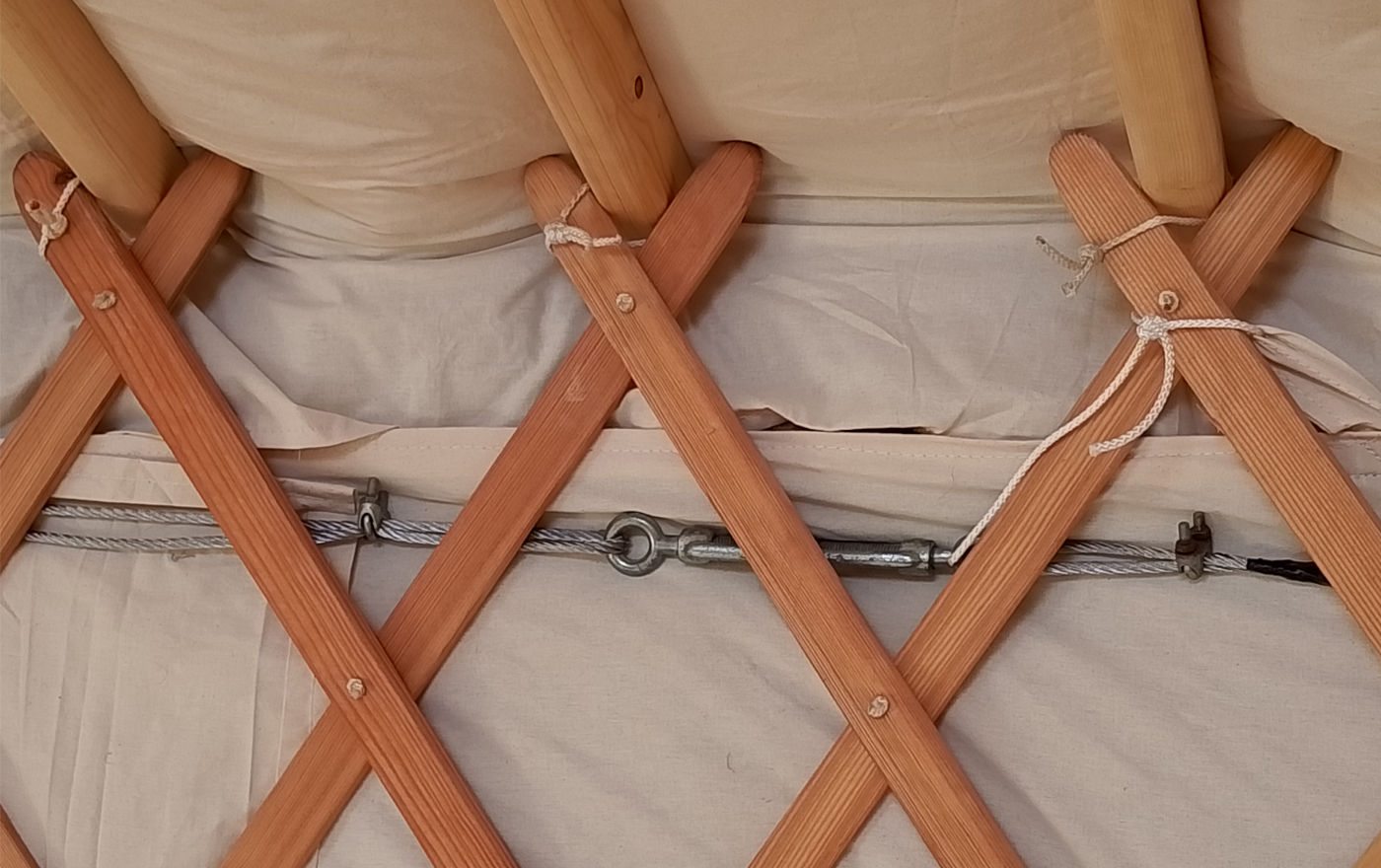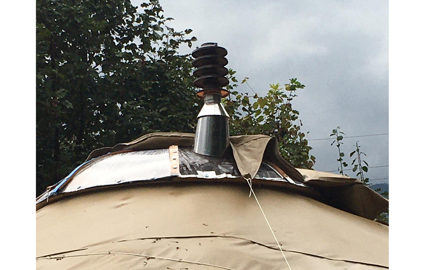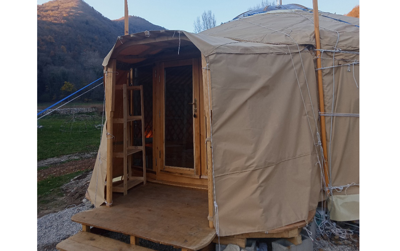 Yurta senza struttura di legno, un sistema di tiranti ed un palo centrale sostengono questa yurta estiva realizzata con tessuto resistente all'acqua e zanzariere tutt'intorno. Possibilità di accendere un fuoco centrale grazie ad un sistema a camino per uscita fumi e ricircolo dell' aria.