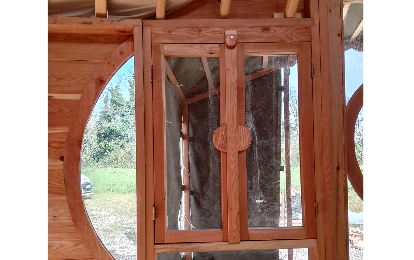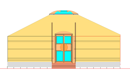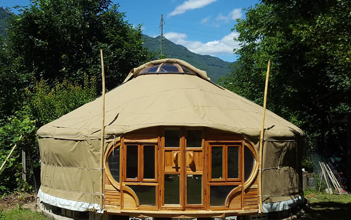 Yurta con ampio portale circolare simmetrico con due finestre apribili laterali alla porta.