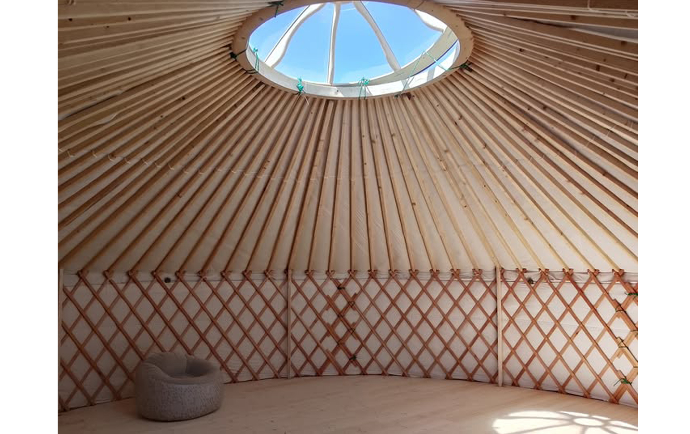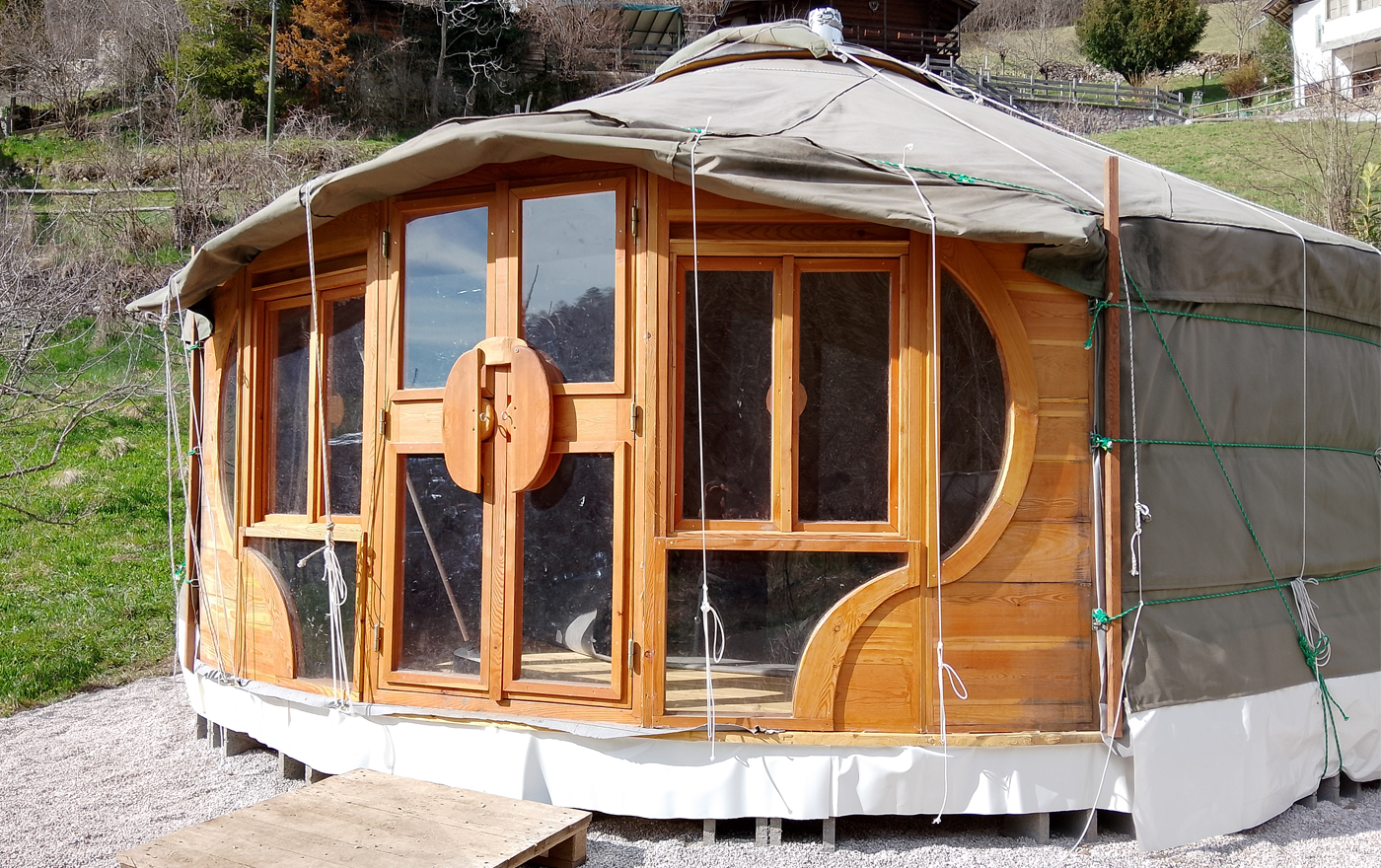 È la yurta più ampia con una grande apertura di circa 5 metri per maggior luminosità e le linee curve per inserirsi in modo più naturale nel giardino e nel paesaggio