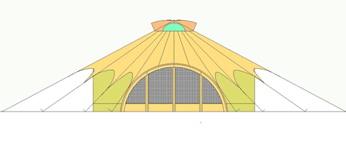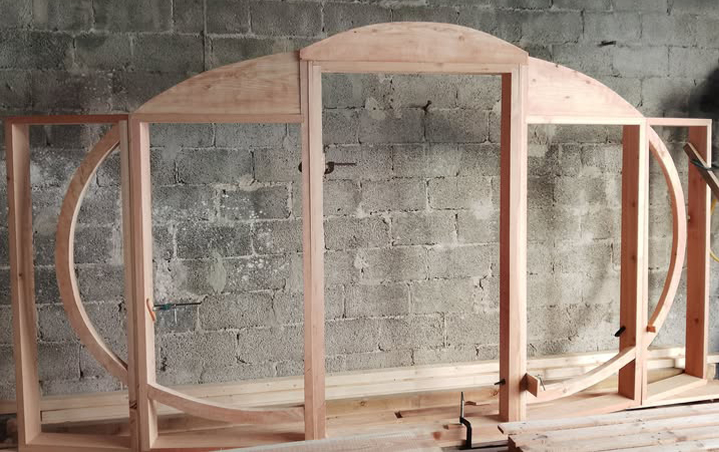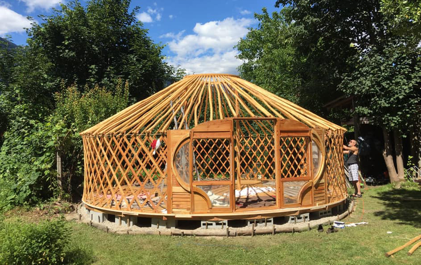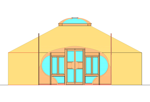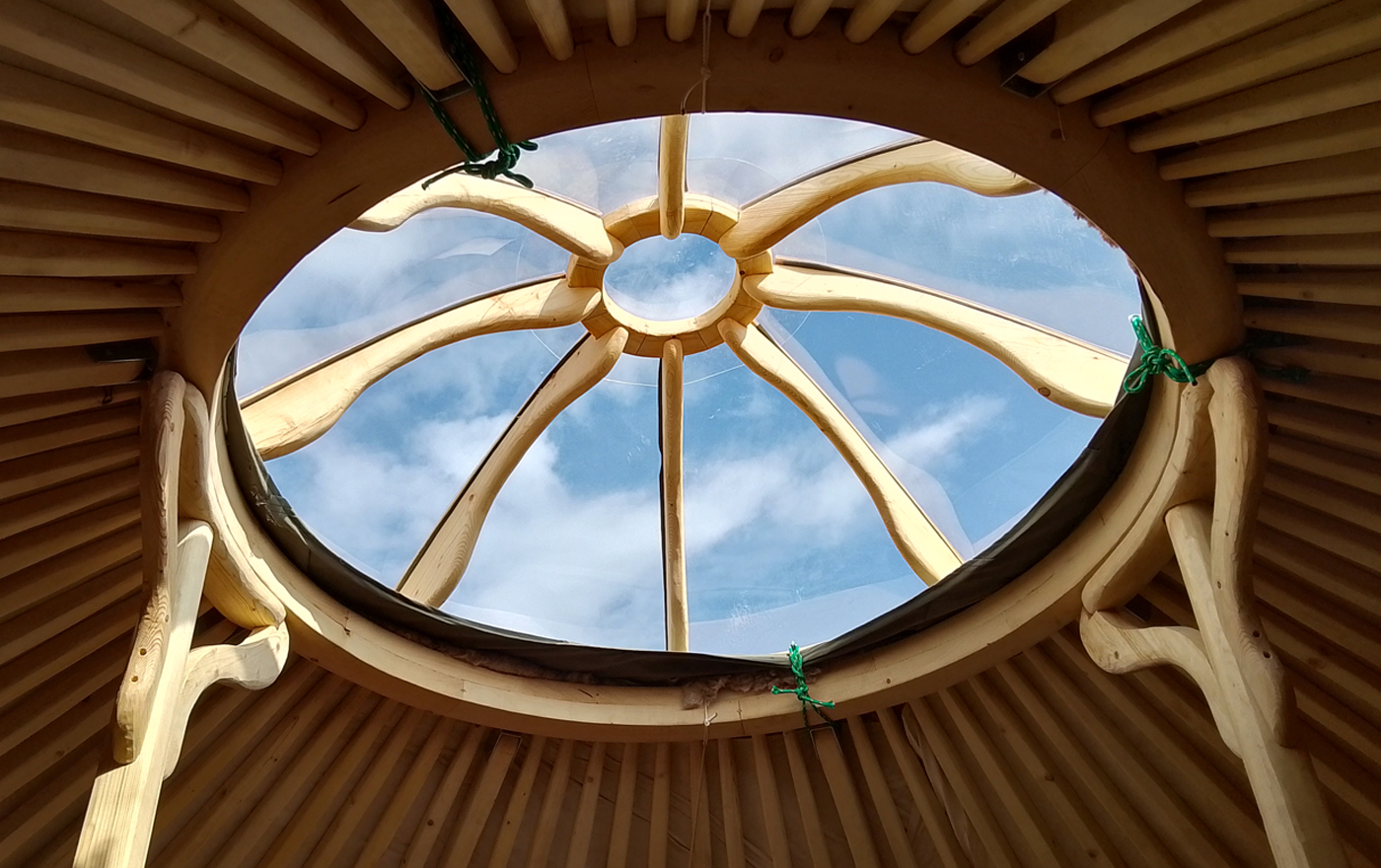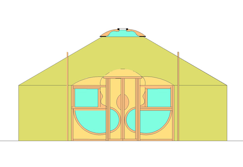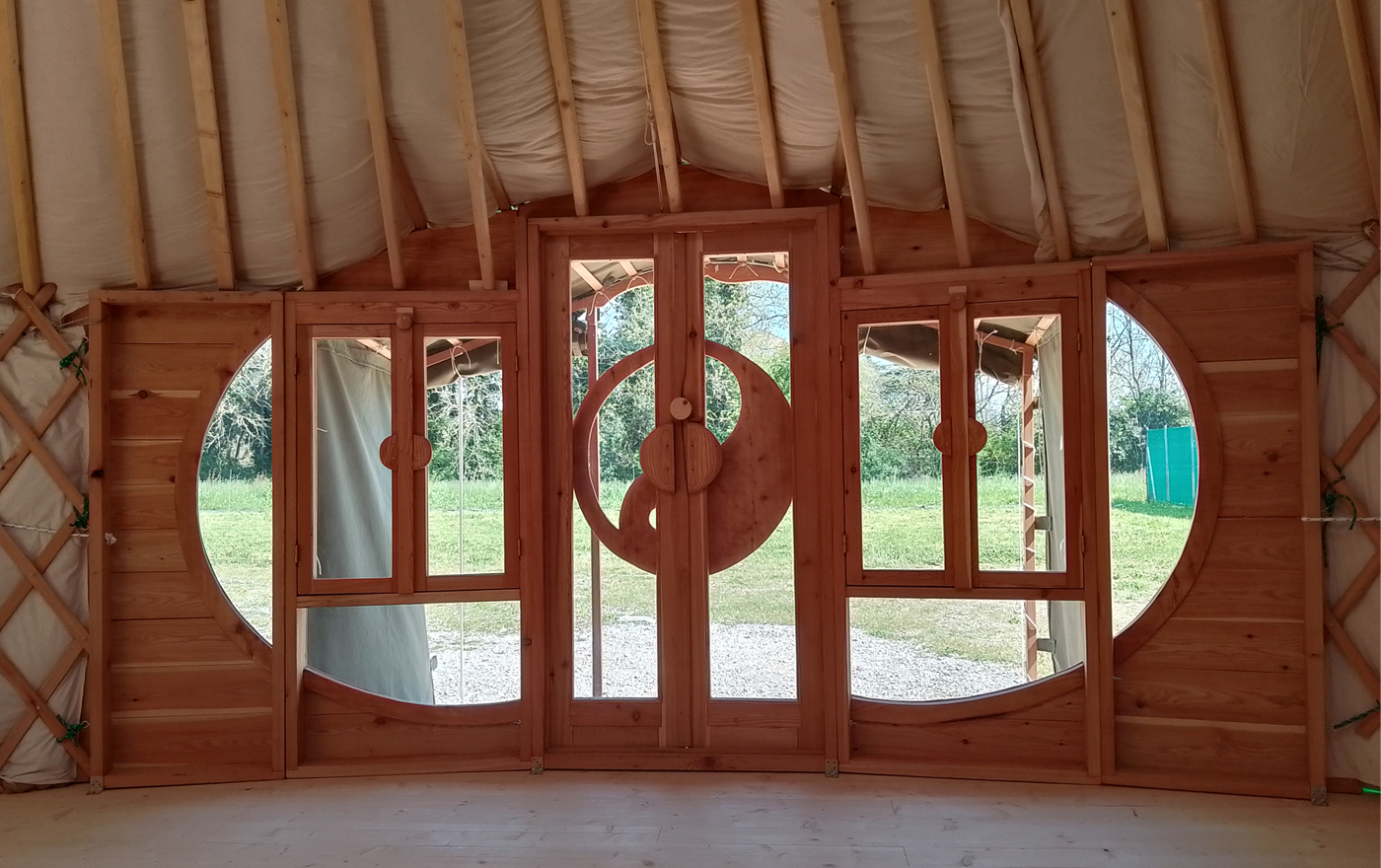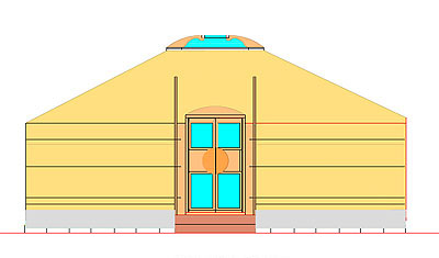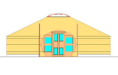 Yurta con ampio portale circolare simmetrico con due finestre apribili laterali alla porta.