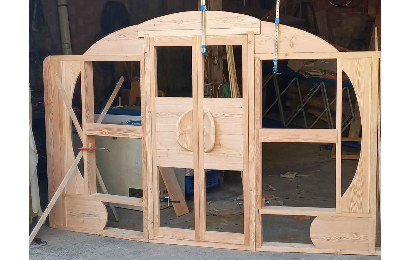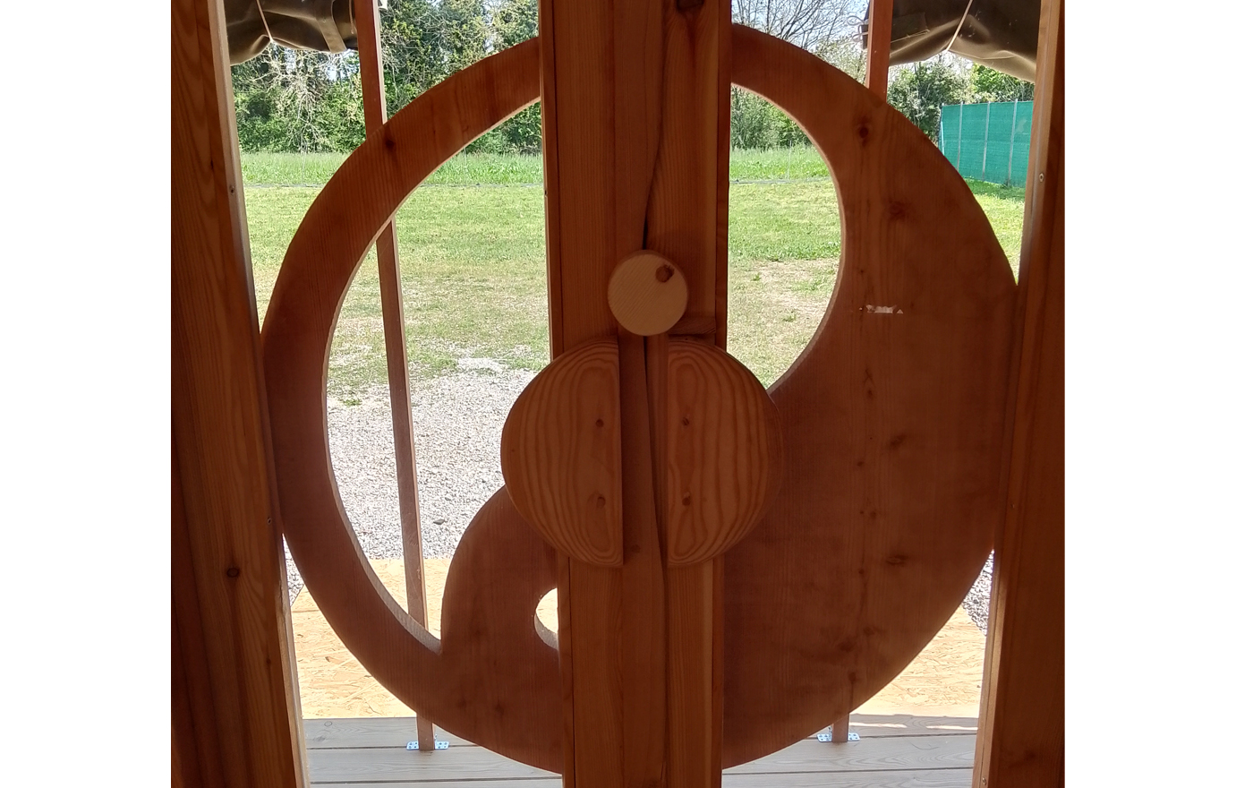 La porta con disegno circolare è più ampia per ricevere maggior luce oppure in alternativa, in basso, la Luna con porta piena, per ottenere maggior privacy all' interno.