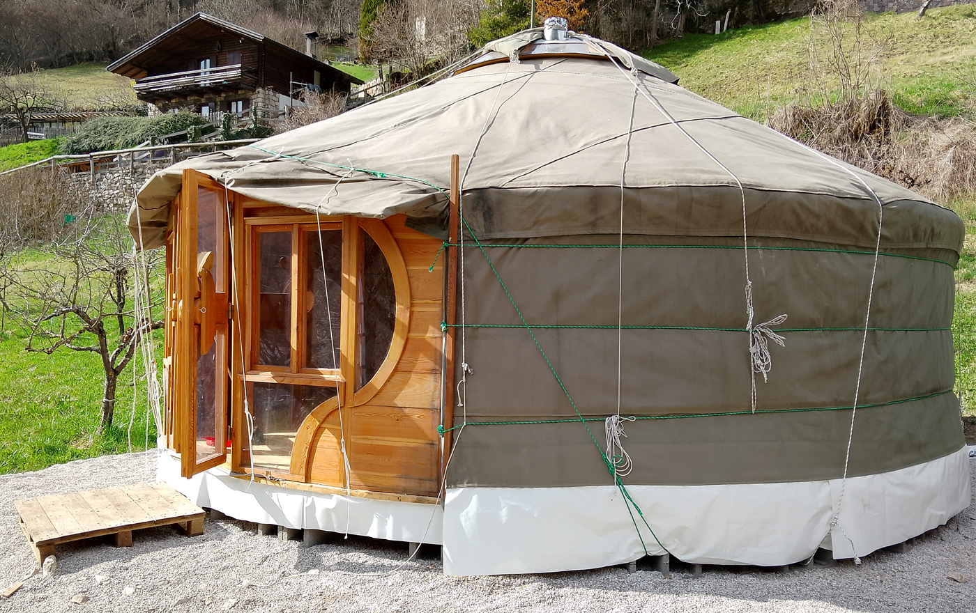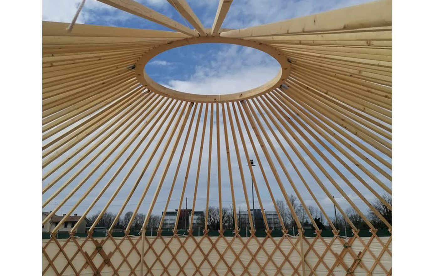 Yurta senza struttura di legno, un sistema di tiranti ed un palo centrale sostengono questa yurta estiva realizzata con tessuto resistente all'acqua e zanzariere tutt'intorno. Possibilità di accendere un fuoco centrale grazie ad un sistema a camino per uscita fumi e ricircolo dell' aria.