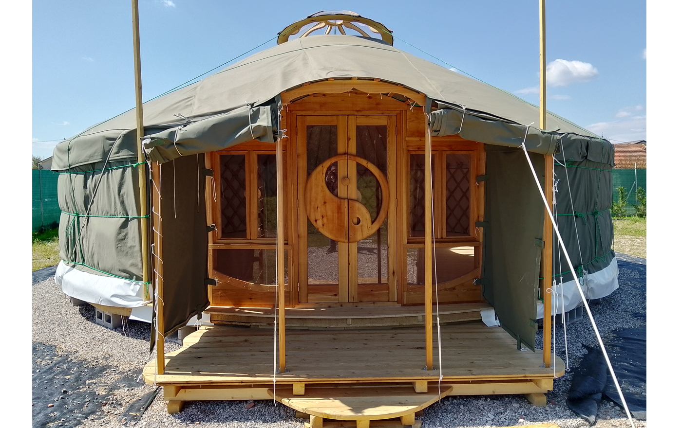 È la yurta più ampia con una grande apertura di circa 5 metri per maggior luminosità e le linee curve per inserirsi in modo più naturale nel giardino e nel paesaggio